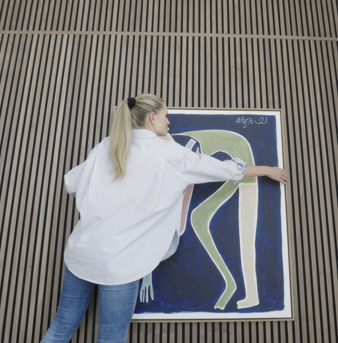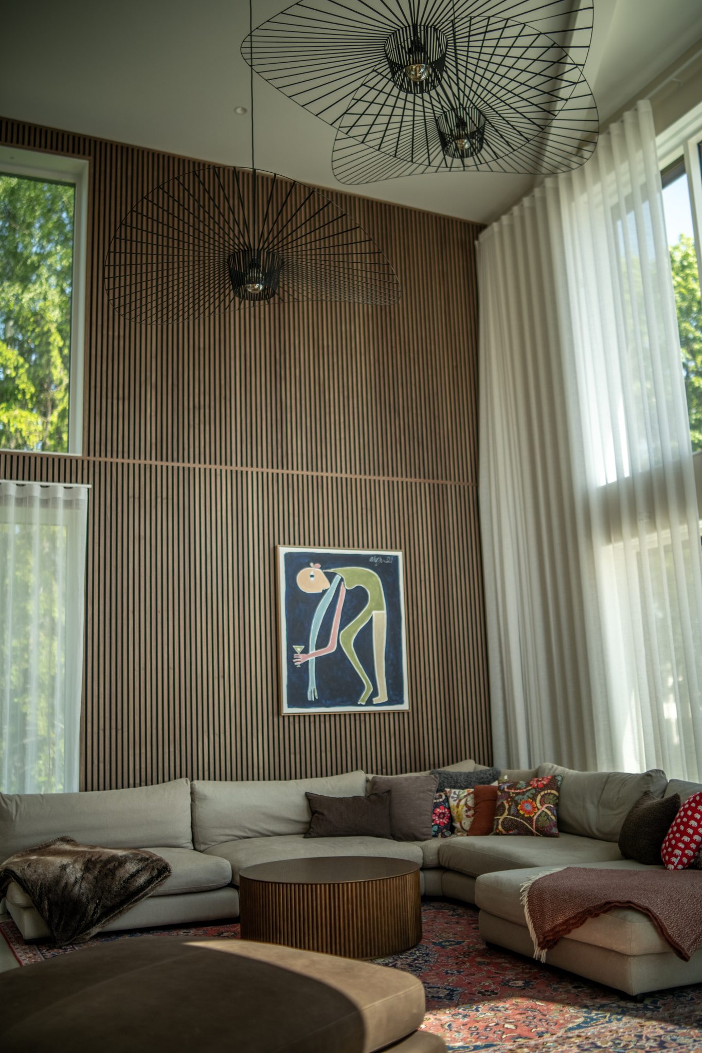 A bright living room with high ceilings and white walls can easily feel sterile and impersonal. The fix? Akupanels from floor to ceiling.