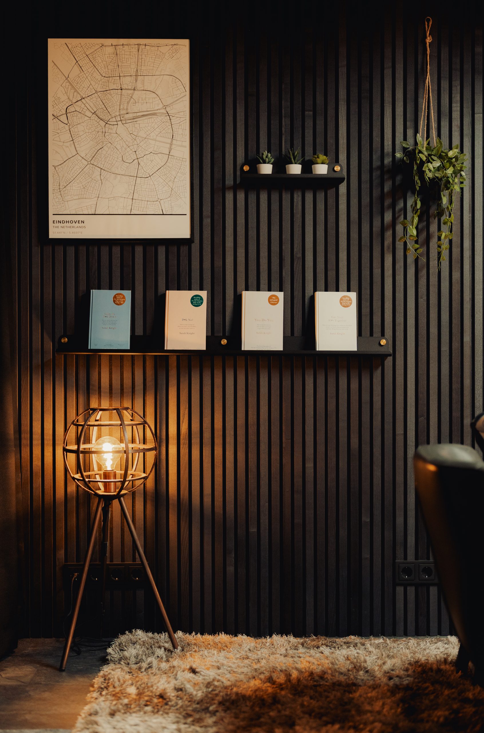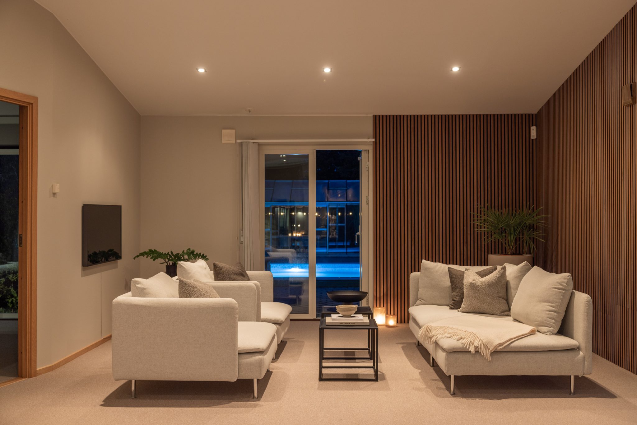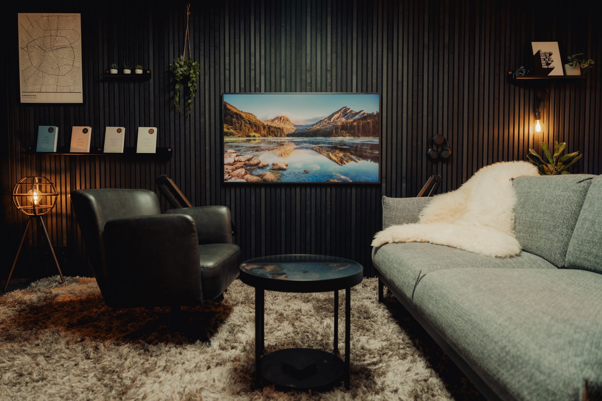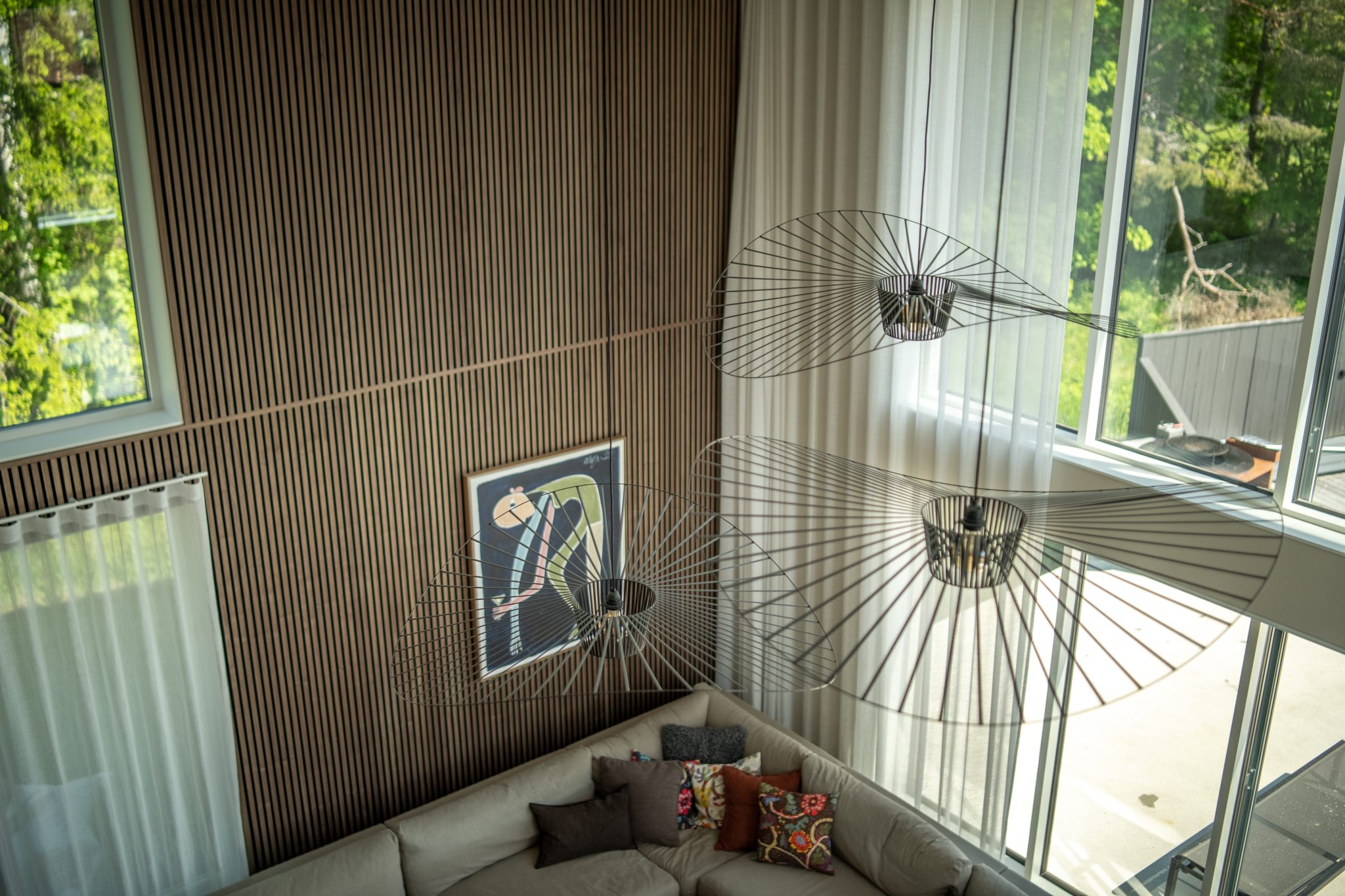 The vertical lines make the ceiling feel even higher. And when the panels are placed in the corner, they create a natural cozy nook — perfect for time with friends and family.