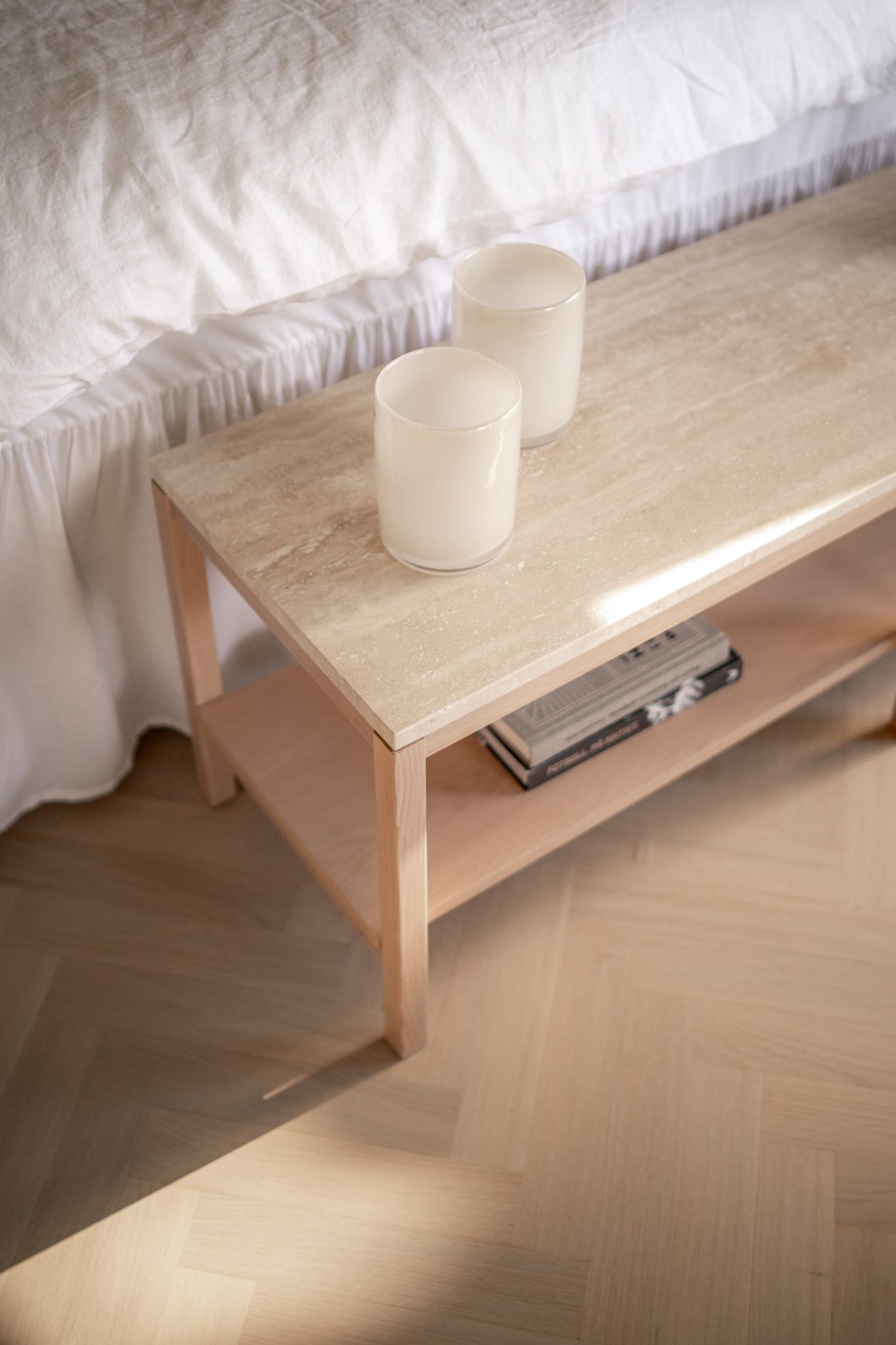 An open bedside table adds lightness, and a bench at the foot of the bed brings balance.