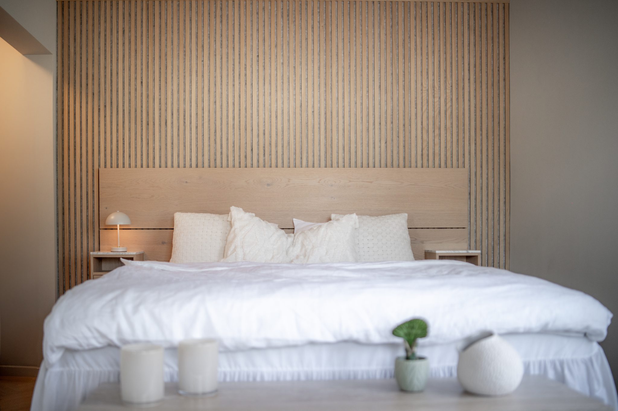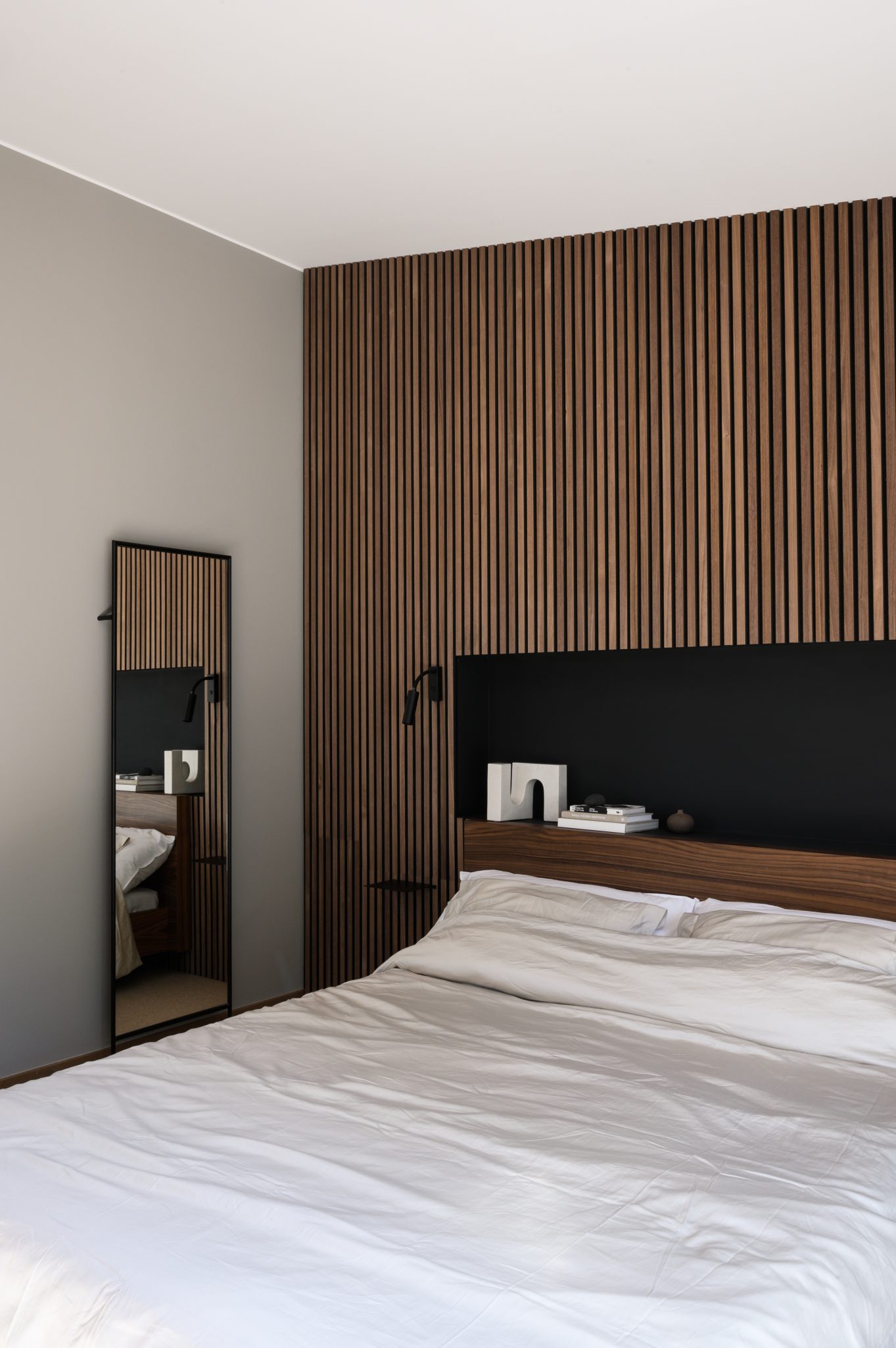 Using dark panels in the bedroom as well creates a sense of continuity throughout the home. The rich wood grounds the space and brings balance — especially in modern homes with lots of white and light.