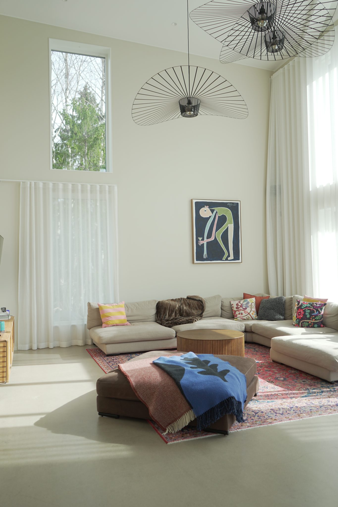 The final project shows the challenge clearly: A room with very high ceilings, raw concrete, and low furniture. The sound bounces, and the space feels… empty.