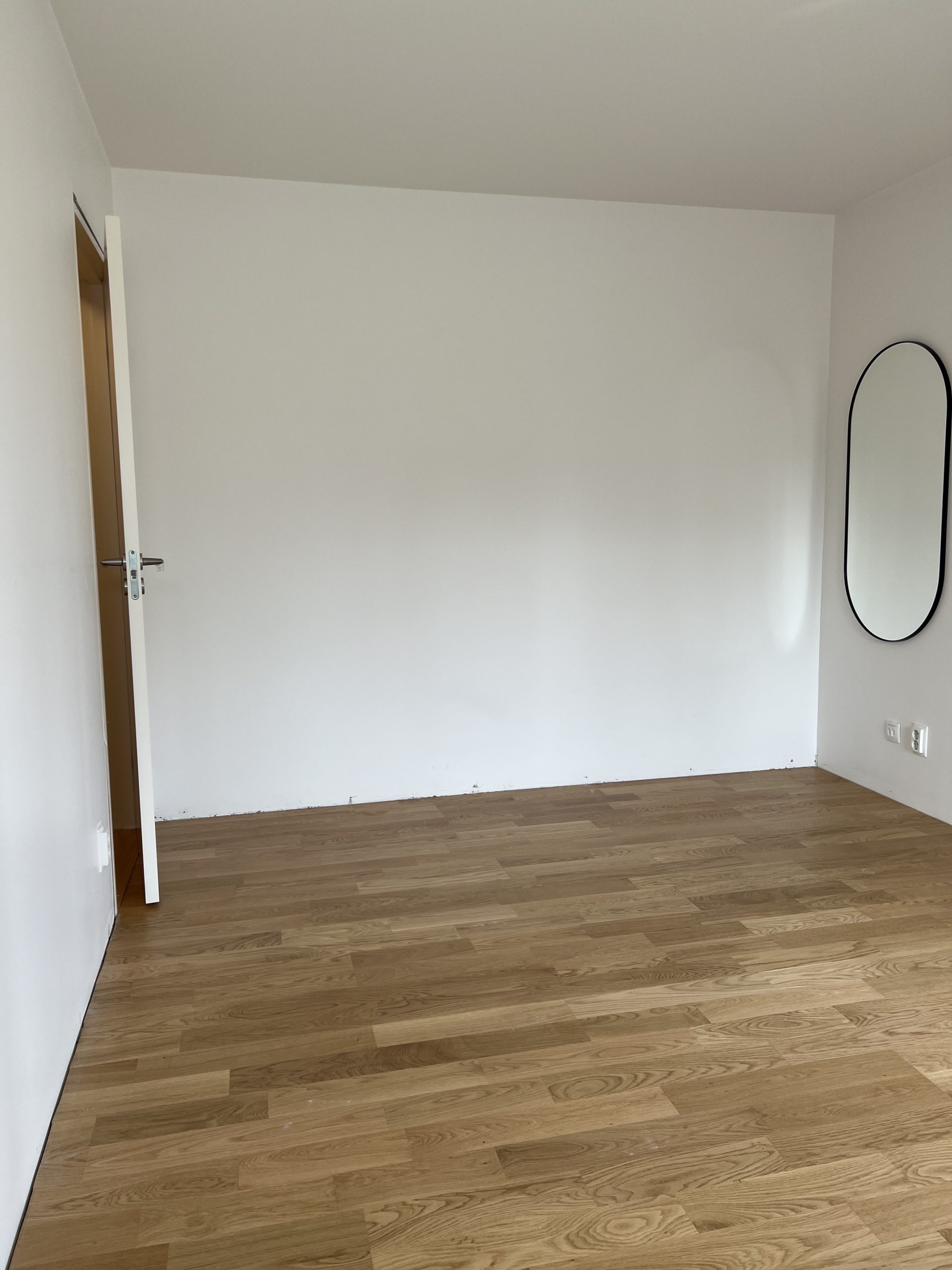 A plain white space with no visual anchor becomes a warm, balanced retreat. By cladding the end wall in classic oak with grey felt, the bed suddenly has something to lean into.