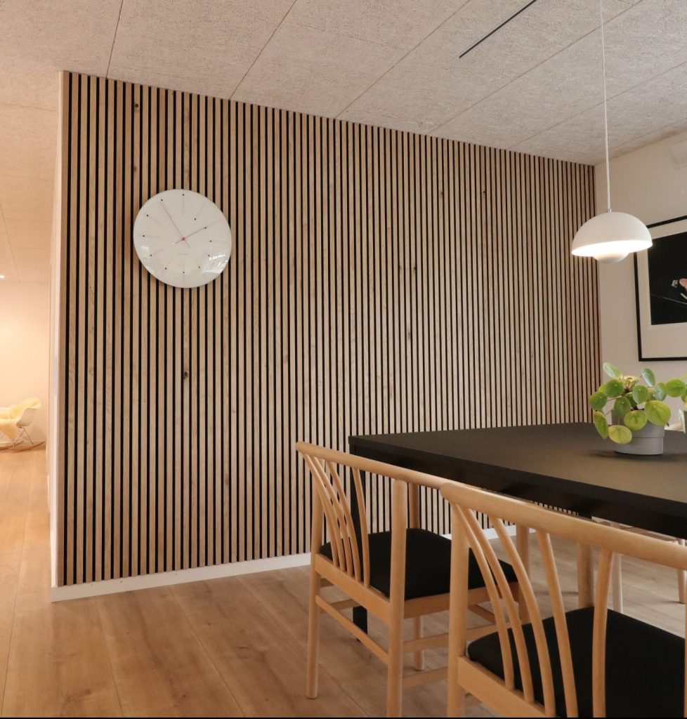 The panels feature slats that help dampen sound and break up sound waves, a process known as diffusion. This enhances their ability to reduce echo and reverberation, creating a more balanced and pleasant acoustic environment.