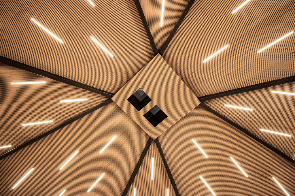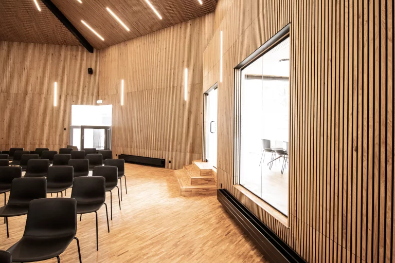 To enhance both the aesthetics and functionality of the space, the panels are tastefully installed on both the ceiling and walls of the expansive area. These panels not only contribute to the room’s modern and sophisticated look but also provide excellent acoustic solutions, ensuring sound quality is optimal for presentations and discussions. This thoughtful design creates a comfortable and effective environment, making it perfect for a wide range of professional events and gatherings.