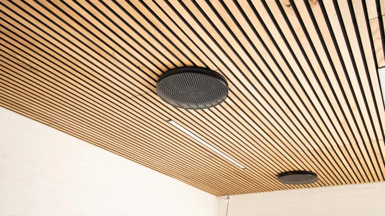 In the smaller meeting rooms, the panels are mounted on the ceiling, providing a sleek & functional enhancement to the spaces. This installation maximises the available wall space while also contributing to the overall aesthetic and acoustic quality of the rooms.
