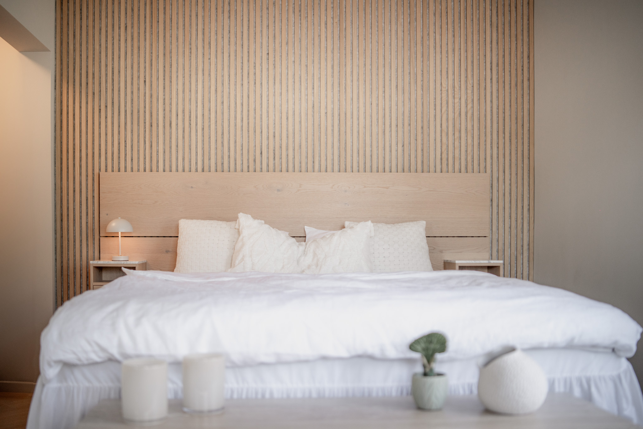 By adding a calming color palette, a few thoughtful details, and incorporating wood panels, they have transformed the bedroom into a warm and inviting space.