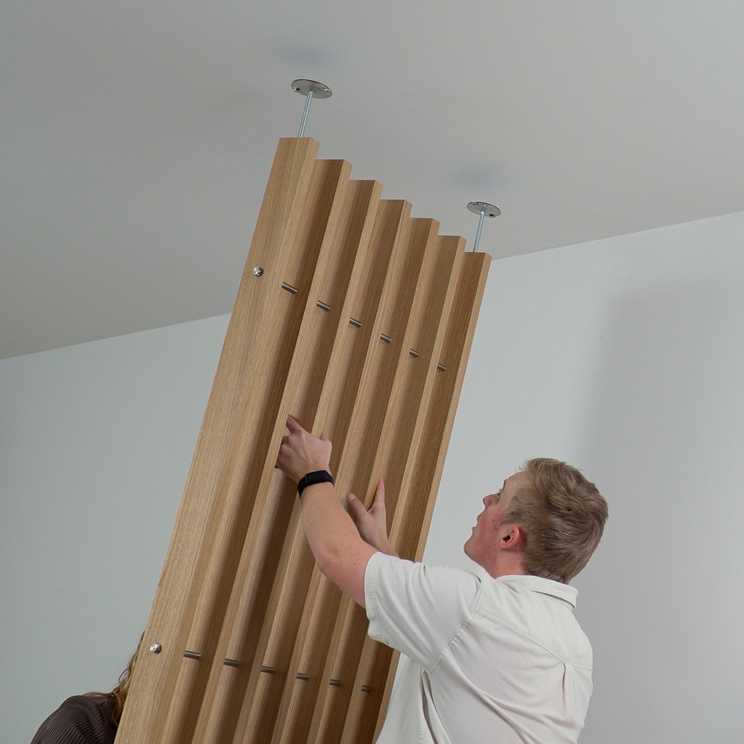 Embrace is installed using a tension system that allows the modules to stand securely between floor and ceiling. For added stability, the system needs to be secured with screws in both the floor and the ceiling.