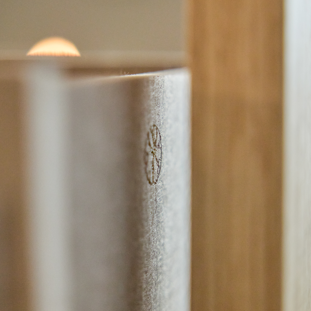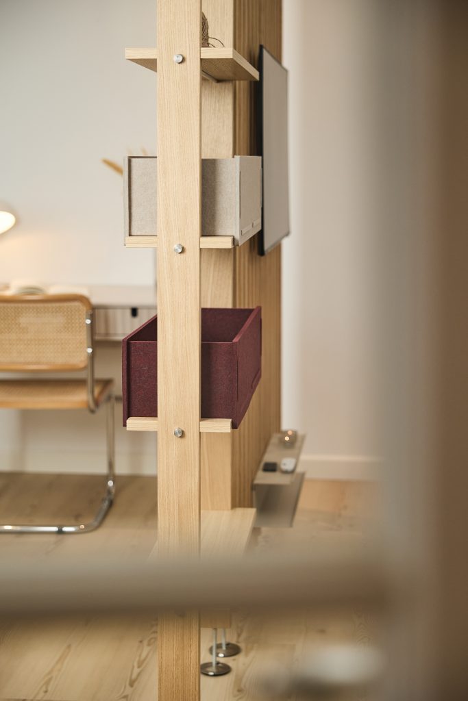 Embrace is built from oak veneer and stainless steel and consists of modular elements that can be arranged and adjusted over time. It’s designed to divide space while keeping rooms open and usable.
