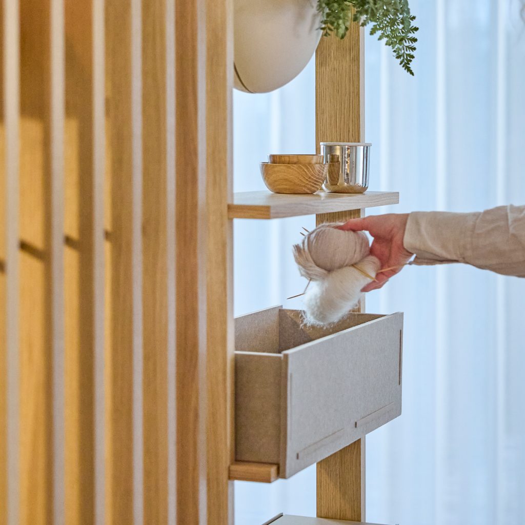 Assemble the box and place it on the Lova Wood Shelf. Fill it with the things you use often but don’t want to look at all the time.