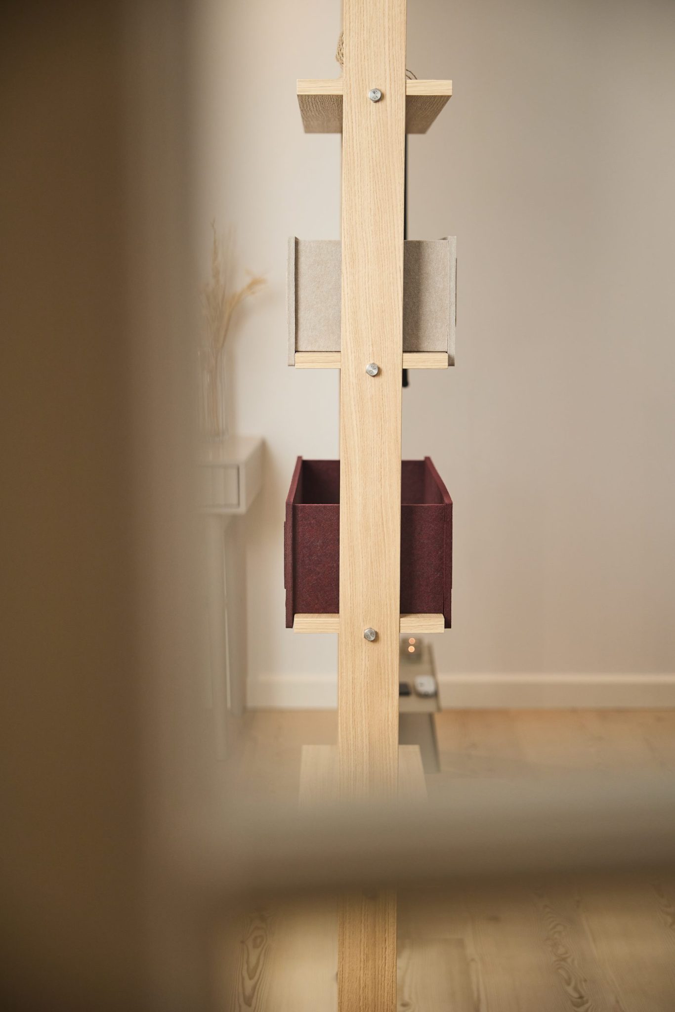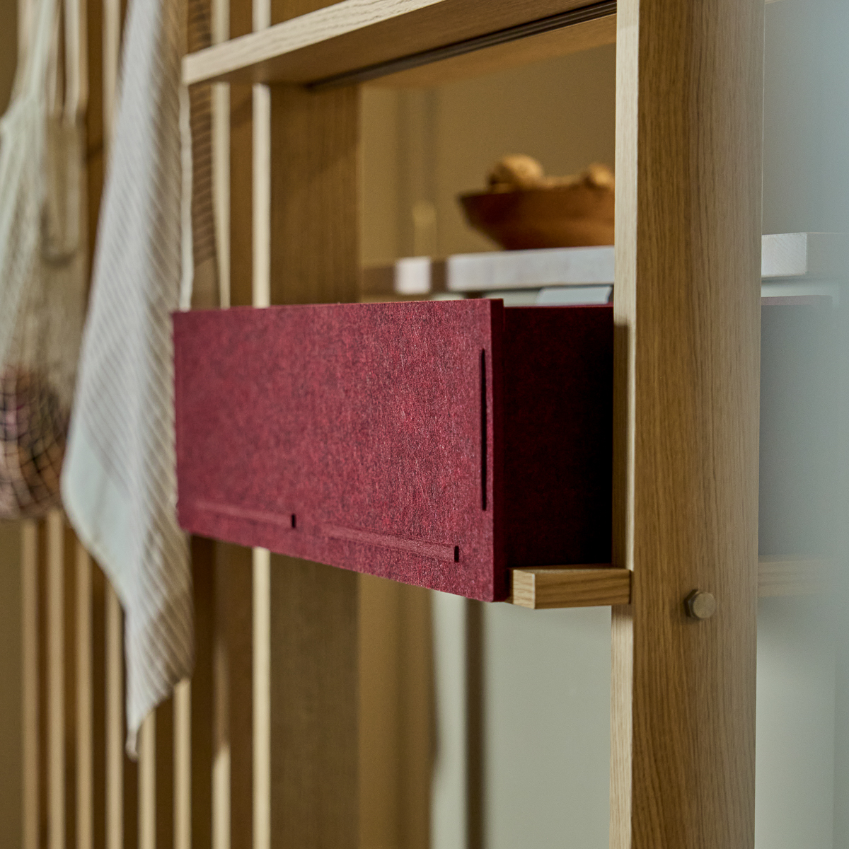 The Vigg Felt Box is a soft storage box made for the Lova Wood Shelf. It’s designed to help you hide everyday items and keep open shelves looking calm and tidy.