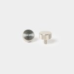 WoodUpp stainless steel knurled thumb screws shown on a white background, two small round metal knobs, one upright with a short threaded stud and the other lying flat revealing a smooth, slightly machined circular top and textured diamond knurling around the sides.