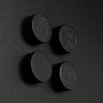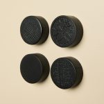 These solid oak magnets in black or natural hold up to 1.5 kg each. The natural oak gives a warm, clean look, while the black is a bit bolder. Each set includes four magnets.