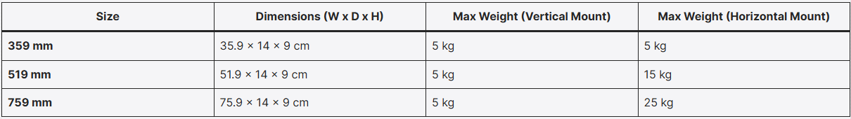 The three shelves have different weight limits depending on size and how your Akupanels are mounted — vertically or horizontally. Here’s a quick overview: